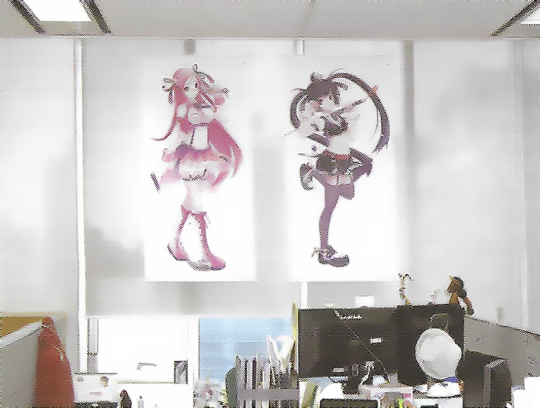 Big posters of Lucia and Kooh hanging on the wall.