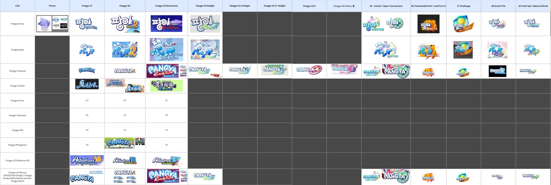 While reviewing the information shared here, I came across a chart about the PangYa servers. I mainly have questions regarding the logos used in the Taiwan, China, SEA, Philipines, and Indonesia versions. First of all, I truly appreciate everything the community has achieved so far. The amount of preserved and shared information is genuinely admirable.